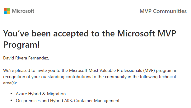 El pasado 1 de noviembre recibí el siguiente correo que me llenó de orgullo: Microsoft me ha nombrado MVP (Most Valuable Professional) 2025 en las categorías Azure y Cloud and Datacenter Management.