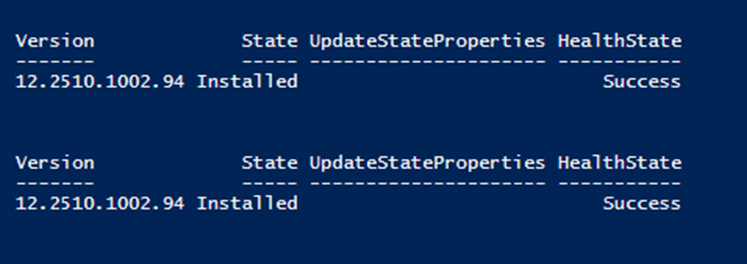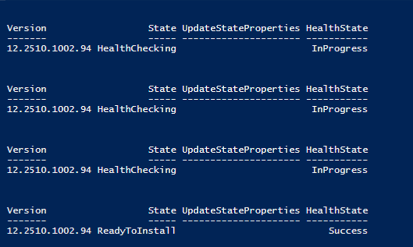 Get-SolutionUpdate -Id «redmond/Solution12.2510.1002.94» | ft Version,State,UpdateStateProperties,HealthState