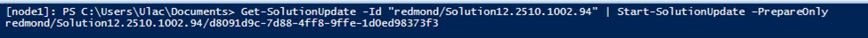 Get-SolutionUpdate -Id «redmond/Solution12.2510.1002.94» | Start-SolutionUpdate –PrepareOnly